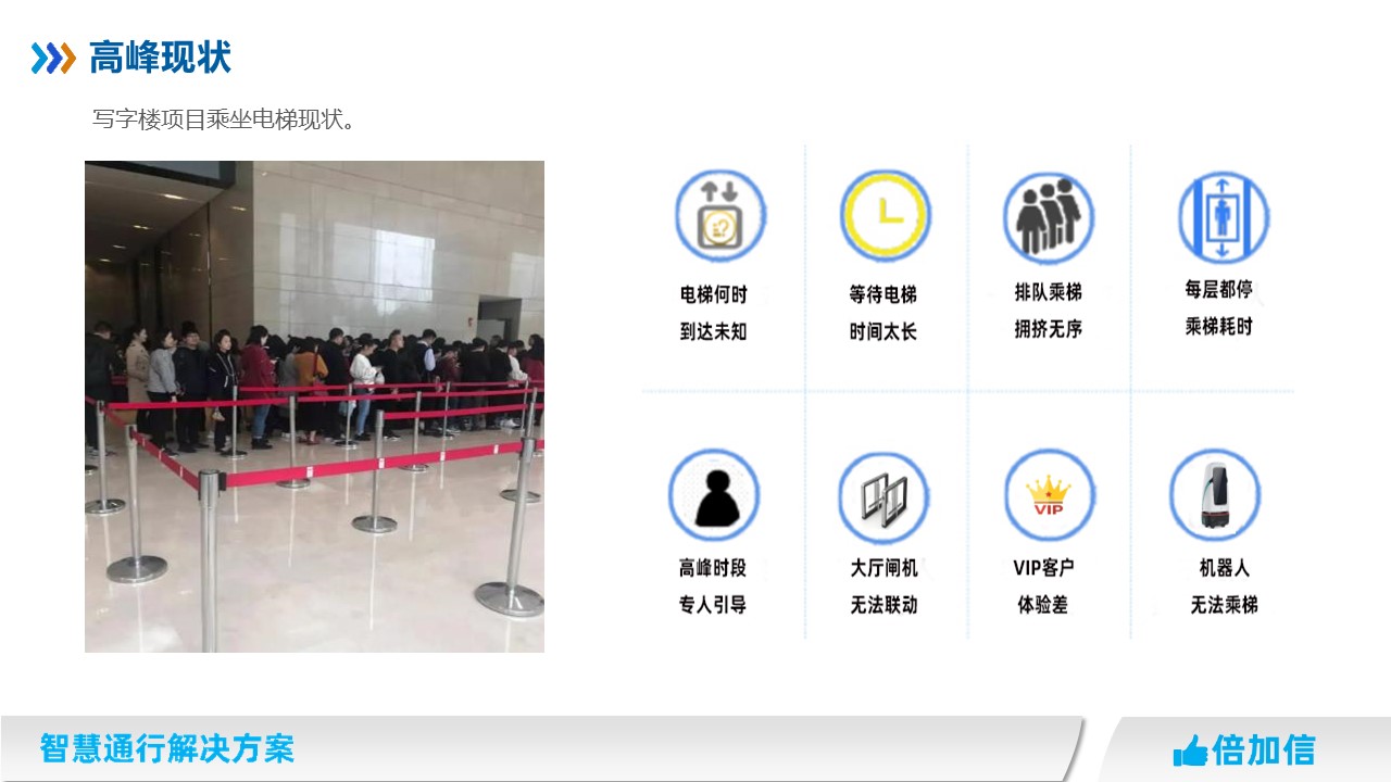 在寫(xiě)字樓場(chǎng)所,早晨上班高峰期、午高峰、下午下班晚高峰,經(jīng)常出現(xiàn)出現(xiàn)排長(zhǎng)隊(duì)擁堵情況,高峰期電梯運(yùn)力不足成為所有寫(xiě)字樓物業(yè)管理的痛點(diǎn)。