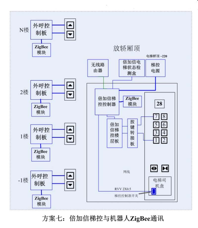 (1)機(jī)器人在電梯外,通個(gè)Wifi或4G網(wǎng)絡(luò)發(fā)送指令給倍加信梯控平臺(tái),倍加信梯控云平臺(tái)收到指令后,將指令發(fā)給倍加信梯控系統(tǒng),倍加信梯控系統(tǒng)自動(dòng)點(diǎn)亮上樓或下樓按鍵,實(shí)現(xiàn)呼梯功能。