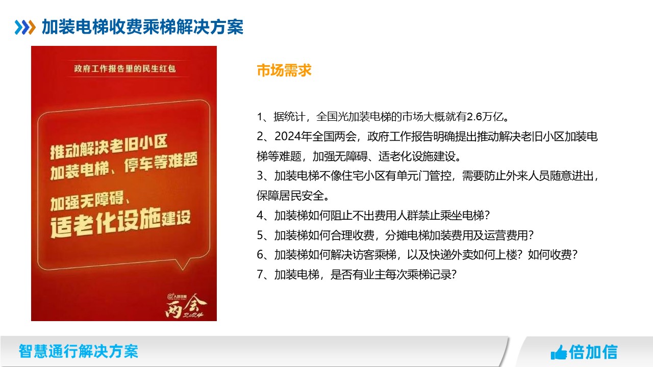 2、2024年全國兩會,政府工作報告明確提出推動解決老舊小區(qū)加裝電梯等難題,加強(qiáng)無障礙、適老化設(shè)施建設(shè)。