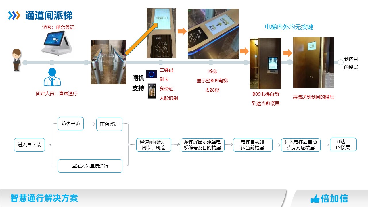 4、通道閘上顯示屏,直接顯示當(dāng)前人員坐哪部梯去對應(yīng)樓層信息;