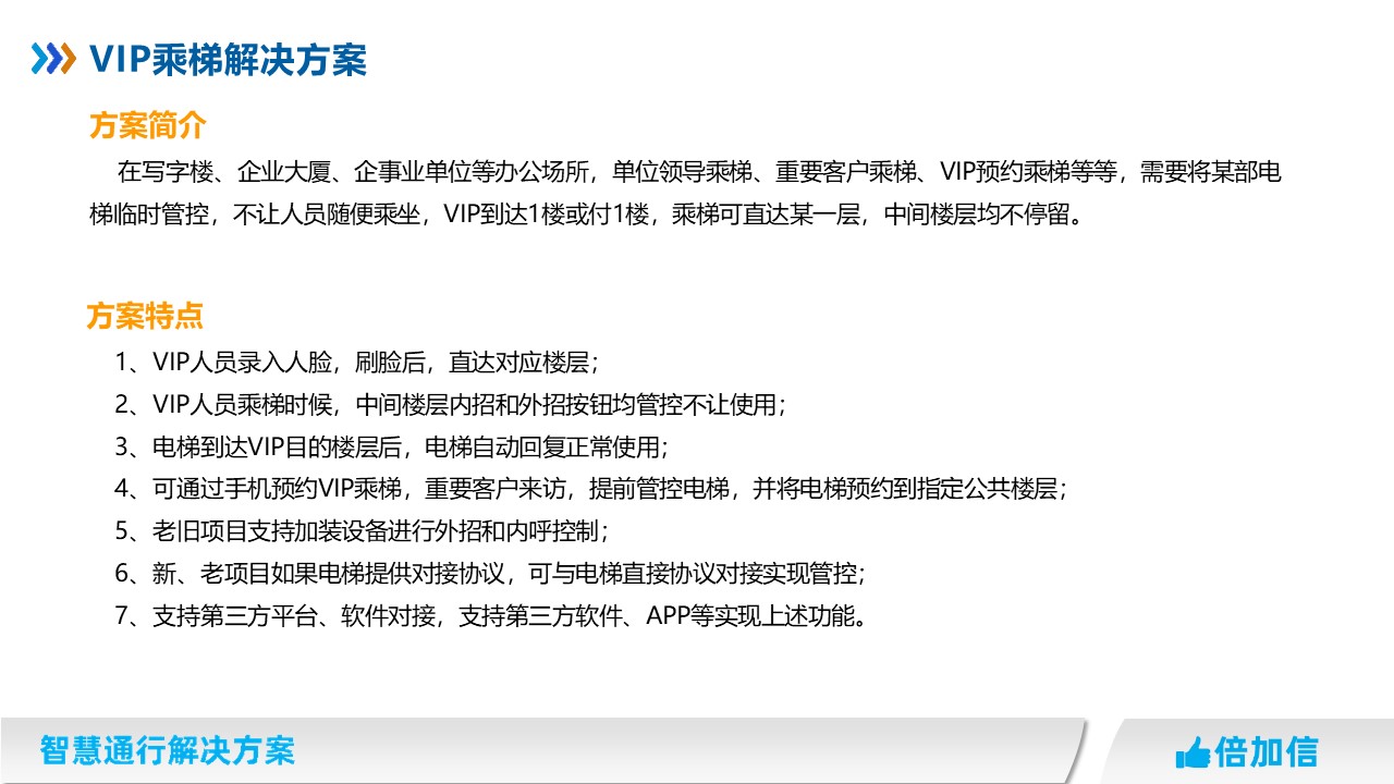 在寫(xiě)字樓、企業(yè)大廈、企事業(yè)單位等辦公場(chǎng)所,單位領(lǐng)導(dǎo)乘梯、重要客戶(hù)乘梯、VIP預(yù)約乘梯等等,需要將某部電梯臨時(shí)管控,不讓人員隨便乘坐,VIP到達(dá)1樓或付1樓,乘梯可直達(dá)某一層,中間樓層均不停留。
