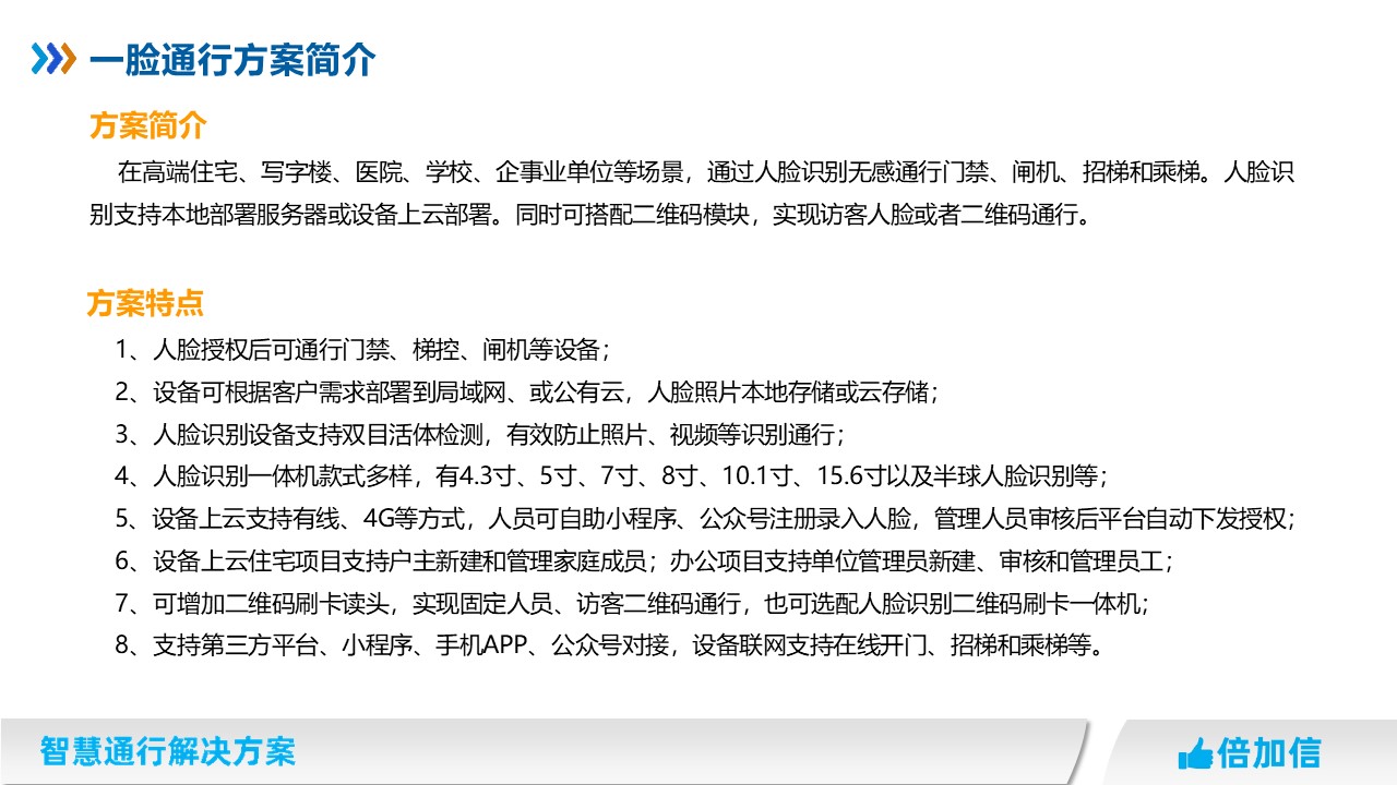 在高端住宅、寫字樓、醫(yī)院、學校、企事業(yè)單位等場景,通過人臉識別無感通行門禁、閘機、招梯和乘梯。人臉識別支持本地部署服務(wù)器或設(shè)備上云部署。同時可搭配二維碼模塊,實現(xiàn)訪客人臉或者二維碼通行。