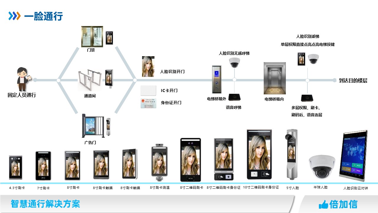 固定人員在門禁系統(tǒng)、梯控系統(tǒng)、通道閘系統(tǒng)、停車場系統(tǒng)、廣告門等系統(tǒng),實現(xiàn)一碼通行、一卡通行、一臉通行。
