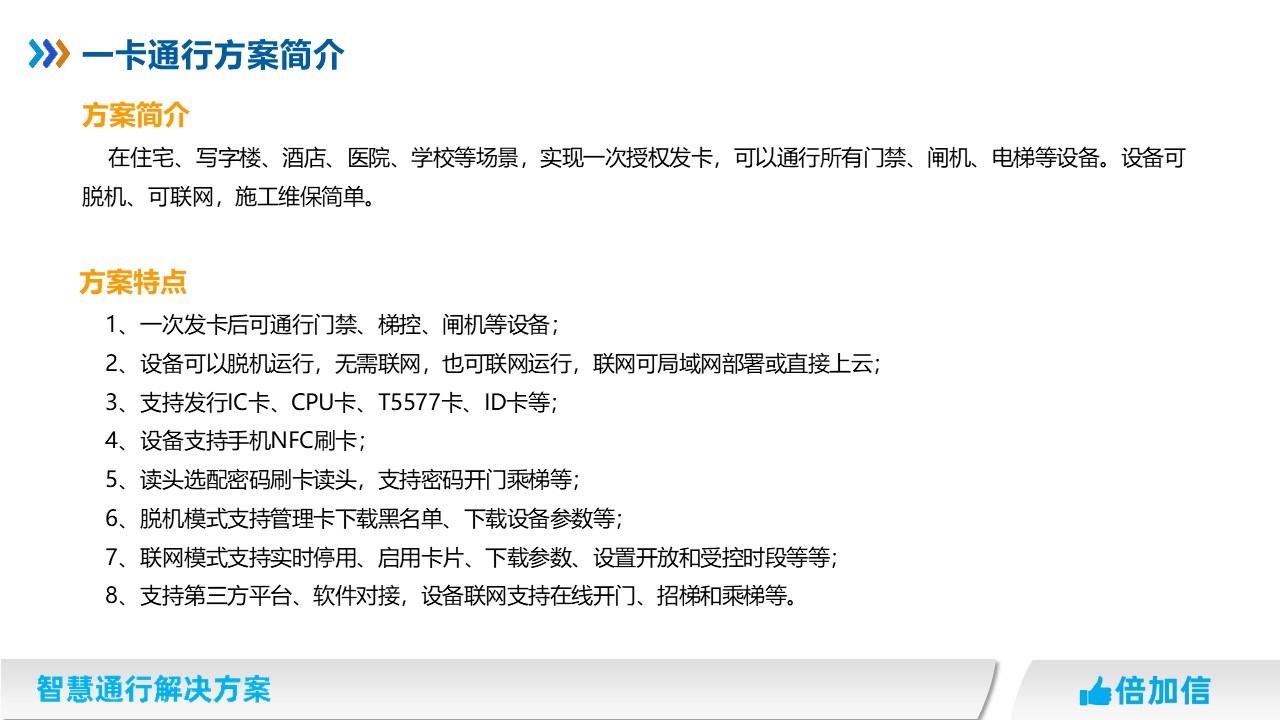 在住宅、寫字樓、酒店、醫(yī)院、學校等場景,實現(xiàn)一次授權(quán)發(fā)卡,可以通行所有門禁、閘機、電梯等設(shè)備。設(shè)備可脫機、可聯(lián)網(wǎng),施工維保簡單。