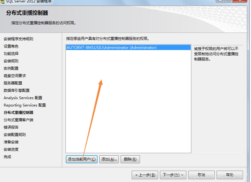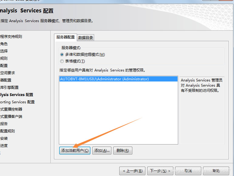 Analysis Services配置,選擇“添加當前用戶”;