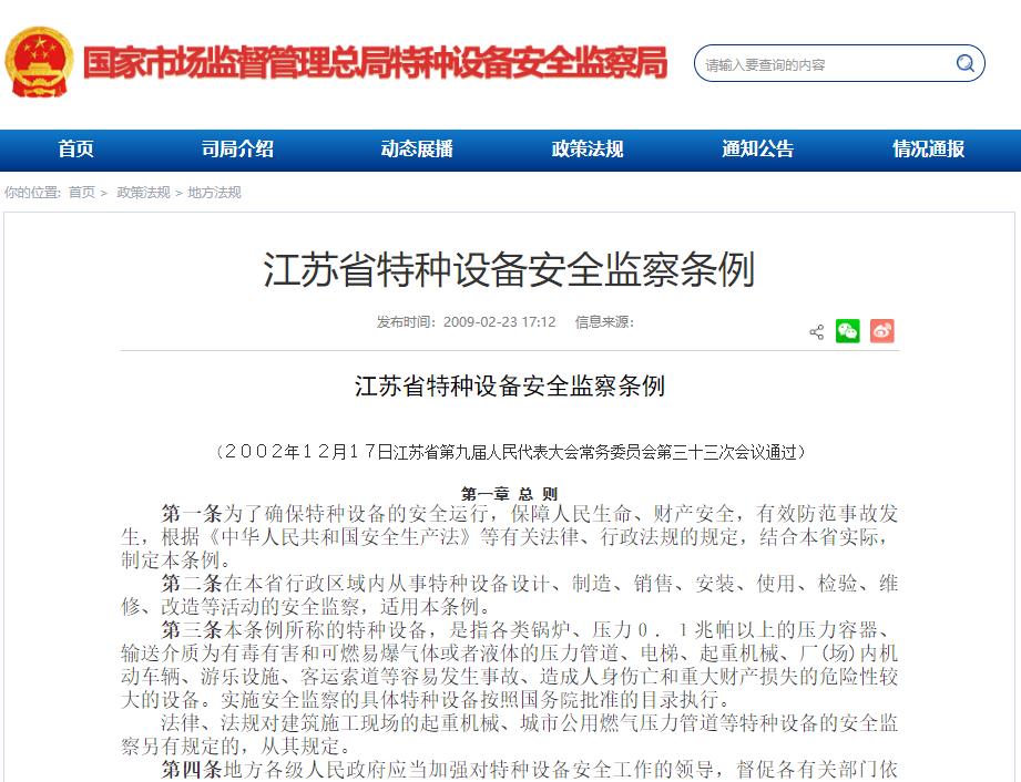 《江蘇省特種設備安全監(jiān)察條例》2002年12月17日江蘇省第九屆人民代表大會常務委員會第三十三次會議通過