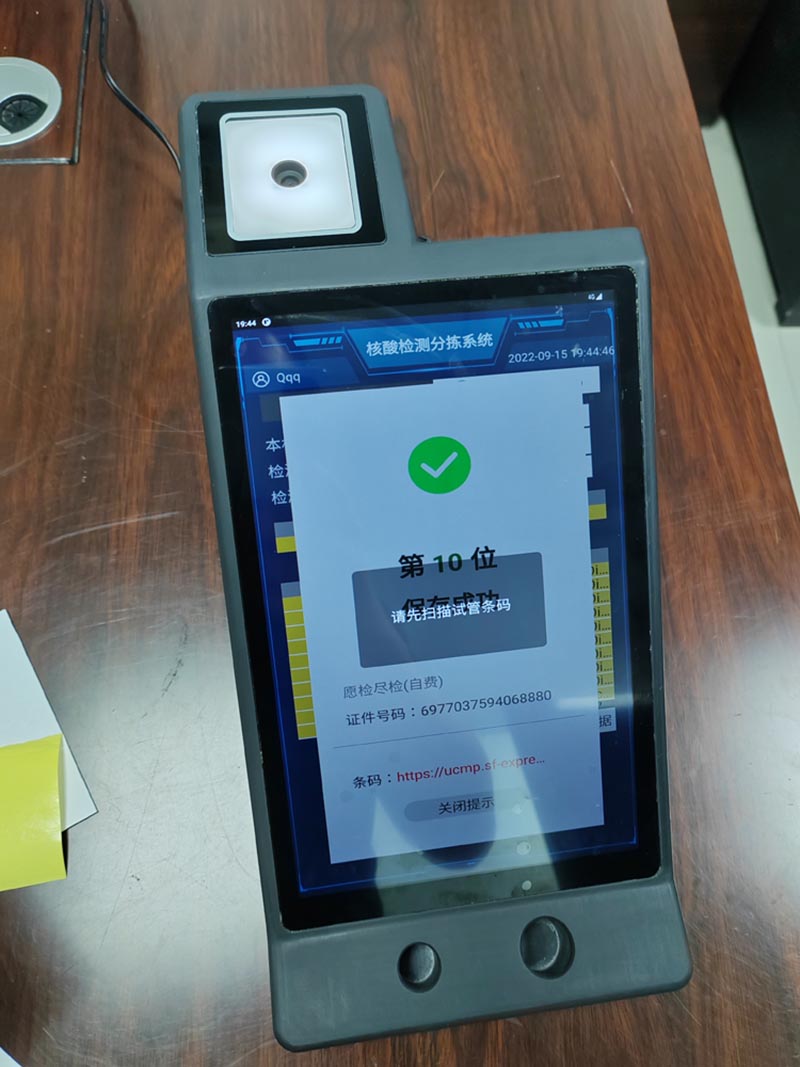 5、依次進行,滿了5人或者10人或者20人后,系統(tǒng)提示掃試管碼,同時上報數(shù)據(jù)給衛(wèi)健委平臺;